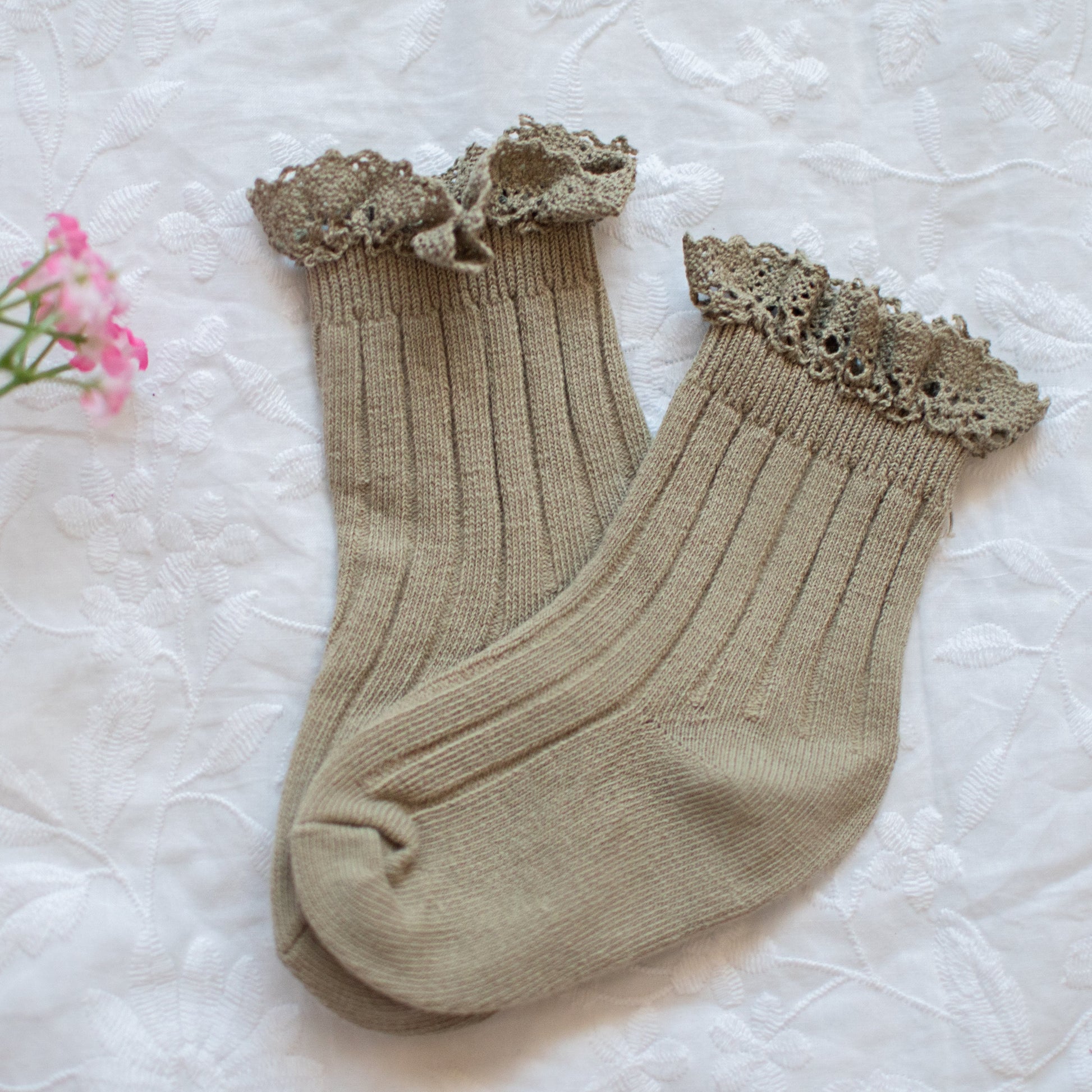 Knitted rib socks with laced ruffle tops designed to compliment a variety of outfits.