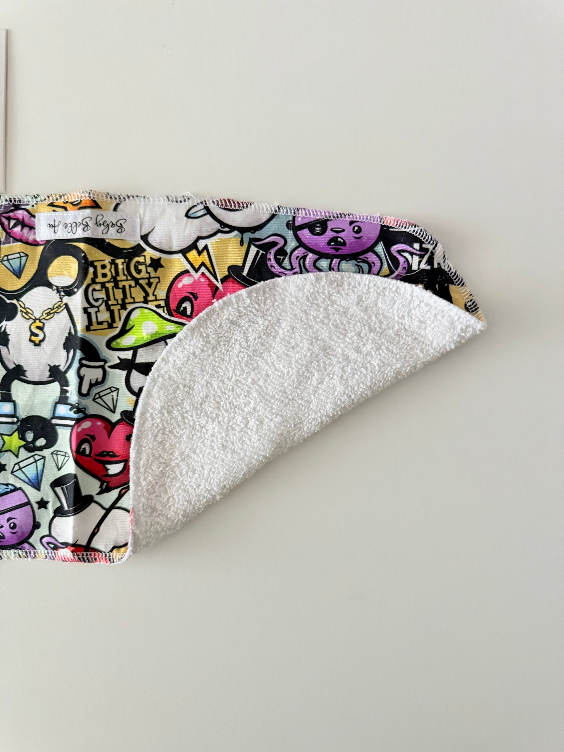 The must have accessory for that spewy baby! These burp clothes are contoured to fit around a shoulder to provide protection while burping your little love.