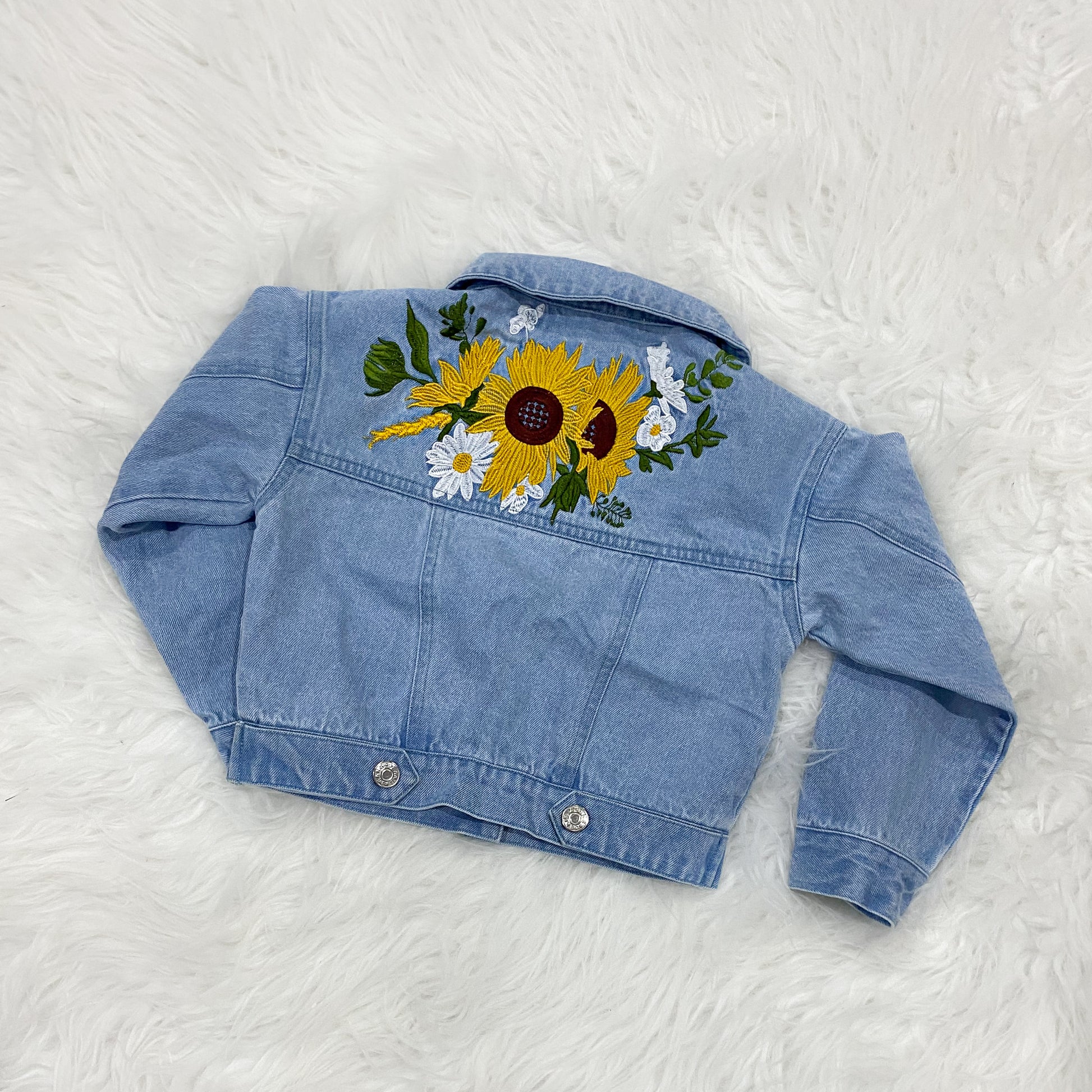 Our beautiful sunflower denim jacket is a lasting designed to be worn again and again and to come out looking as fresh as new every time. In the front you will find 2 functioning waist pockets (great for stashing all those goodies found when adventuring), functioning button up front & sleeve buttons to keep the cool air away. Turn around and on the back you will find a stunning sunflower embroidery design located on the upper back turning this jacket into a true statement piece!