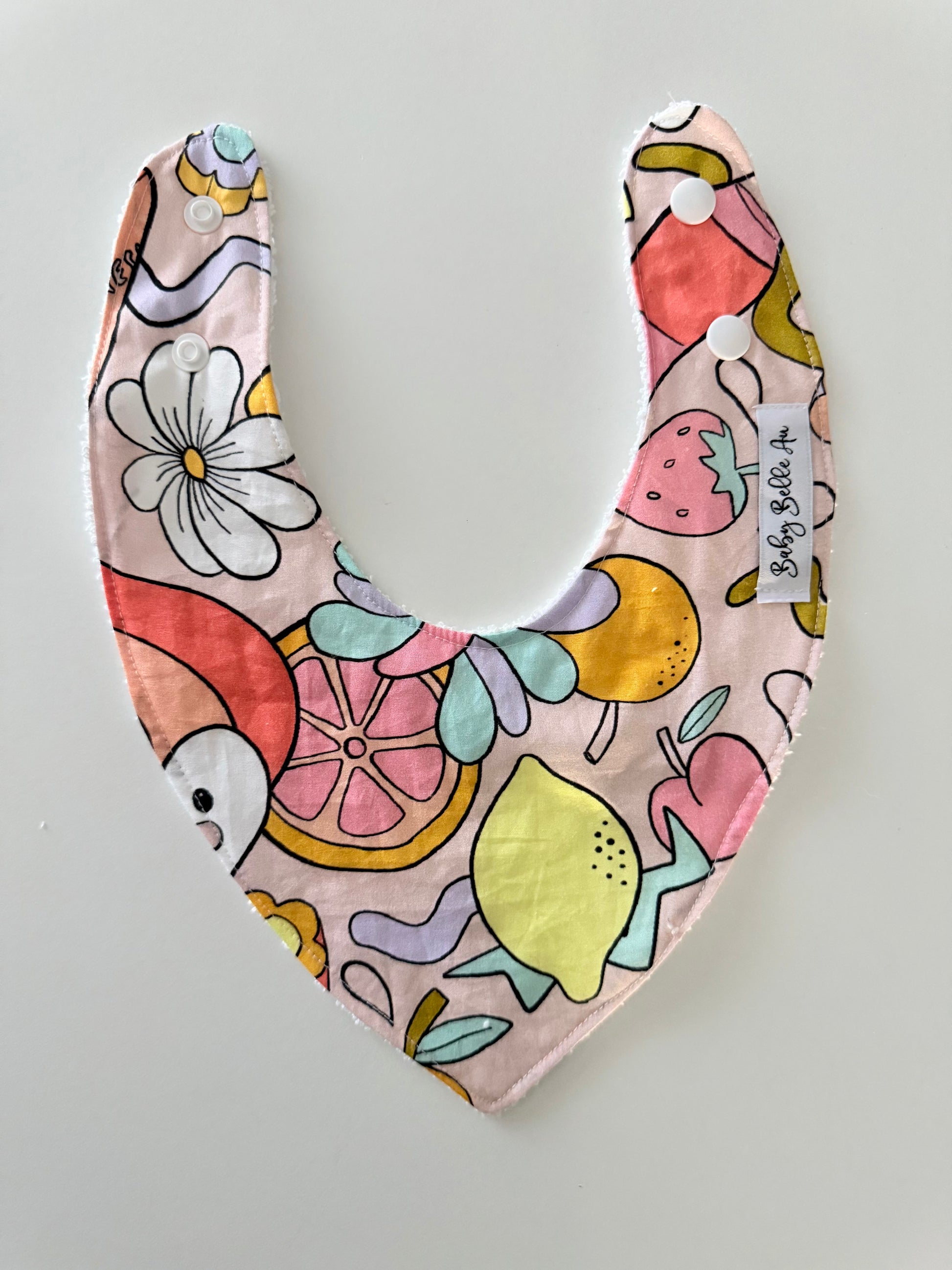 Beautiful grow with me style dribble bib! Start with both snaps attached for a more snug fit for younger babies and transition to a single snap as baby grows. These are a must have stylish option for catching all those baby dribbles before they soak through to delicate skin.