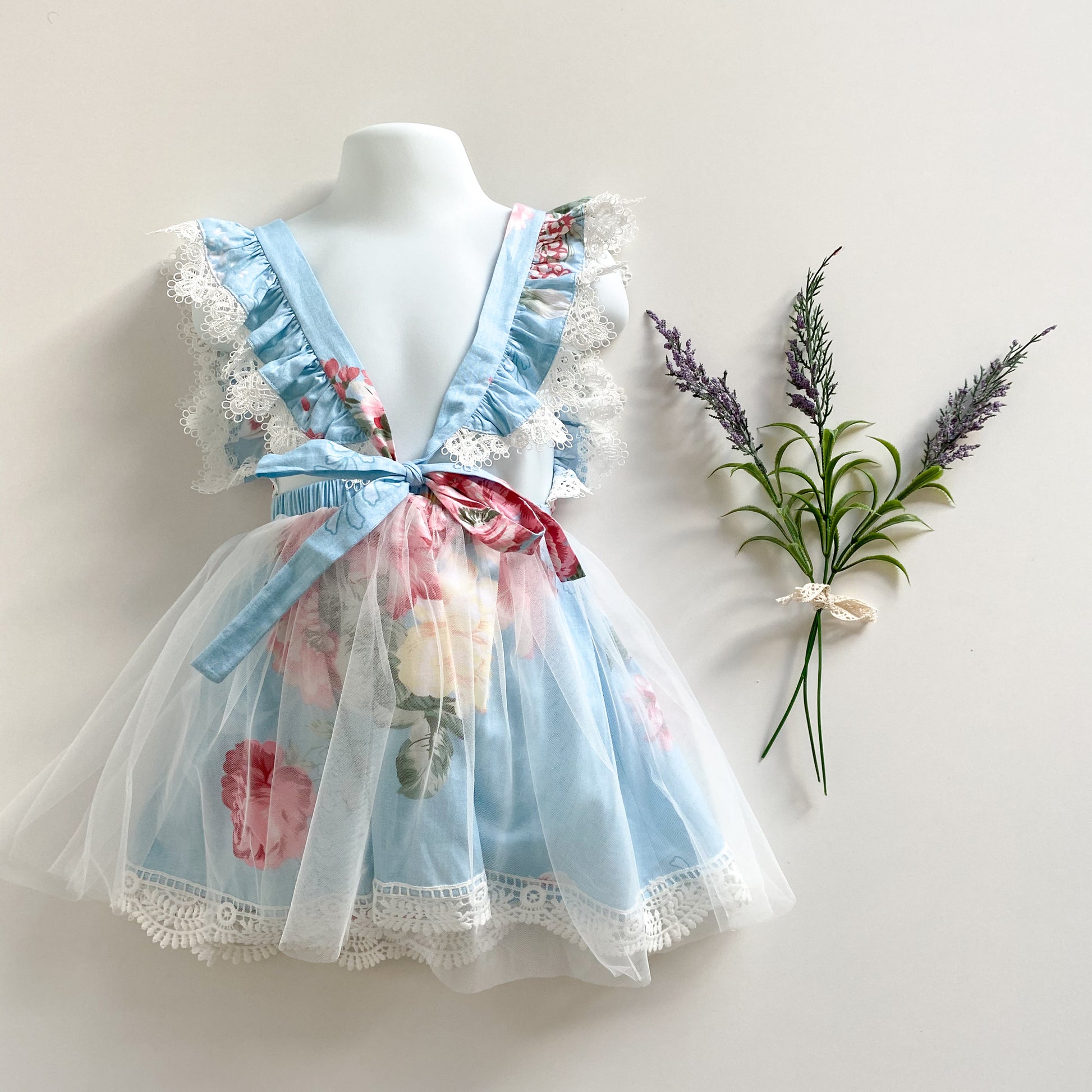 - Lace trimmed flutter bodice featuring a contoured bib with piping detail.