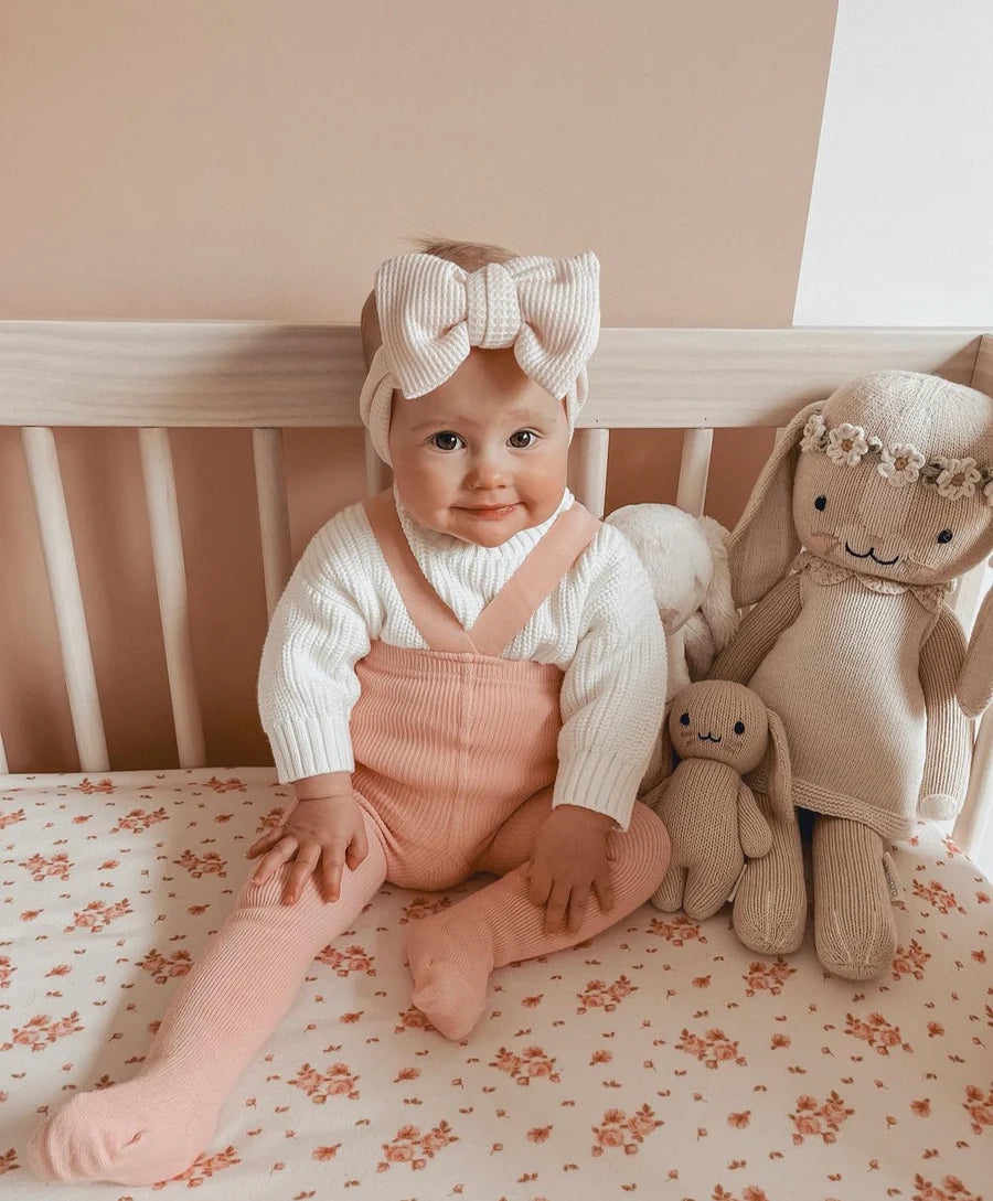 Our adorable footed baby suspender tights are the perfect piece for your little love. Made from soft and stretchy cotton spandex, with braces and enclosed feet for ultimate comfort. Braces keep our tights up, even if your little love is on the move!
