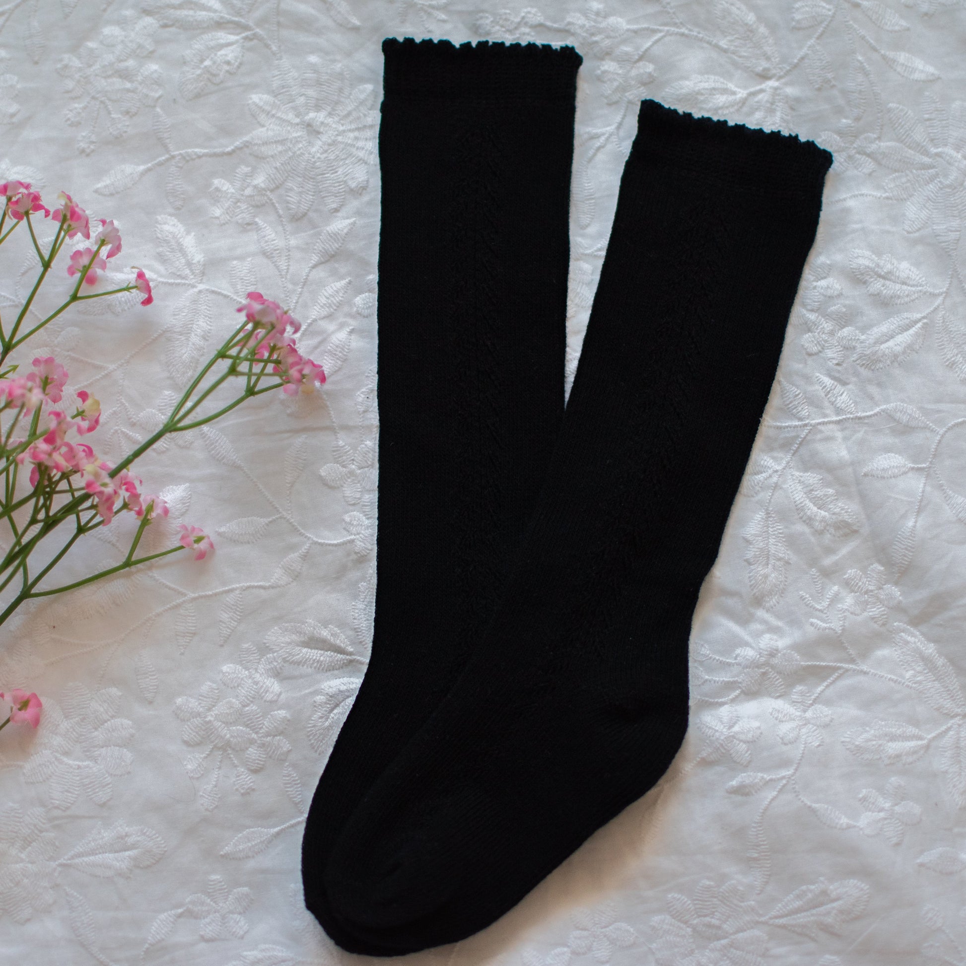 Knitted knee high socks with lattice side feature designed to compliment a variety of outfits.